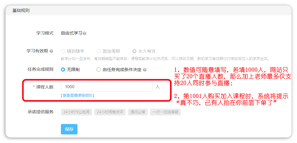 1、如果直播人数购买了20人,课程的人数可以是任何数值,比如1000,但是直播开始时,最多只能有20人进入直播教室。