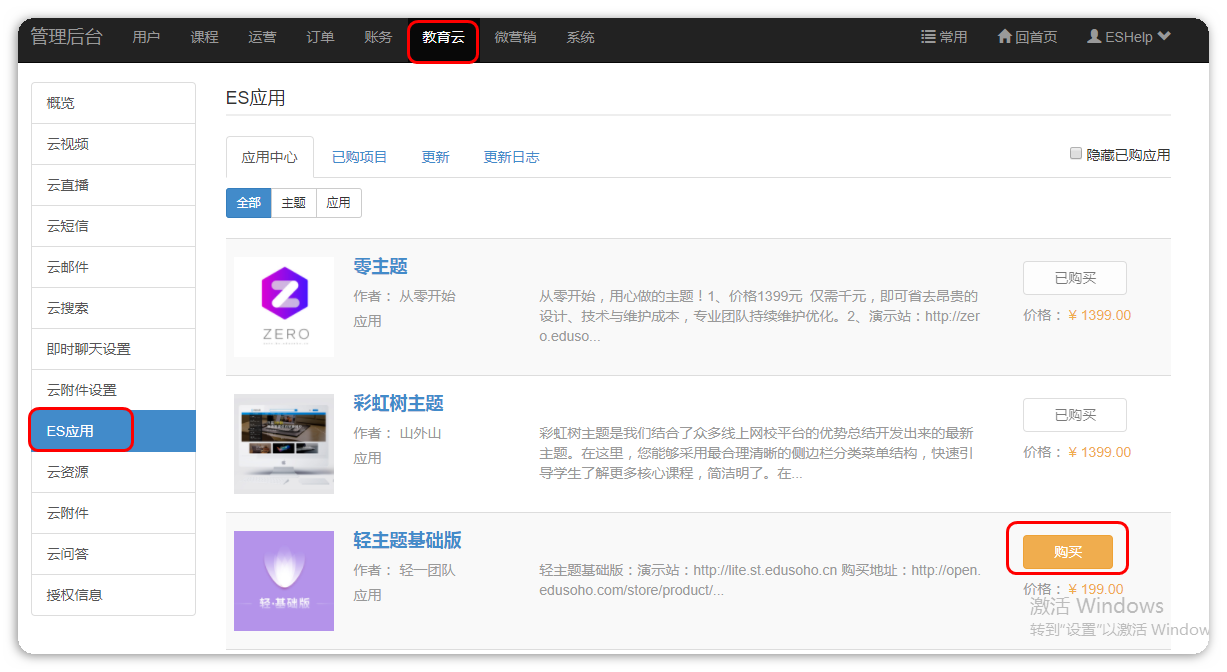 方式二: 到ES的云应用平台购买。 http://open.edusoho.com/store