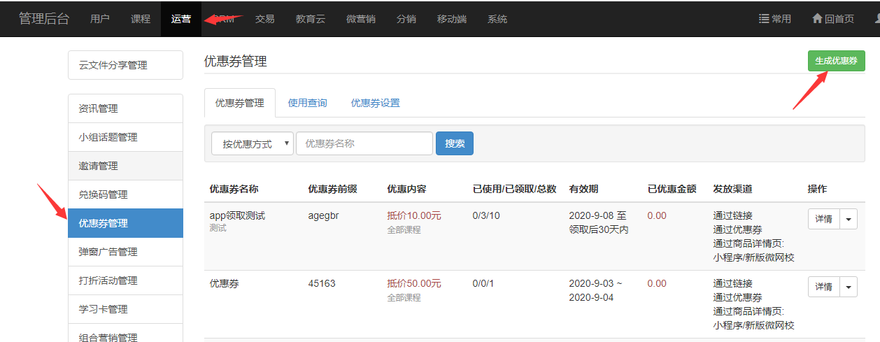 生成优惠券路径:【管理后台】-【运营】-【优惠券管理】