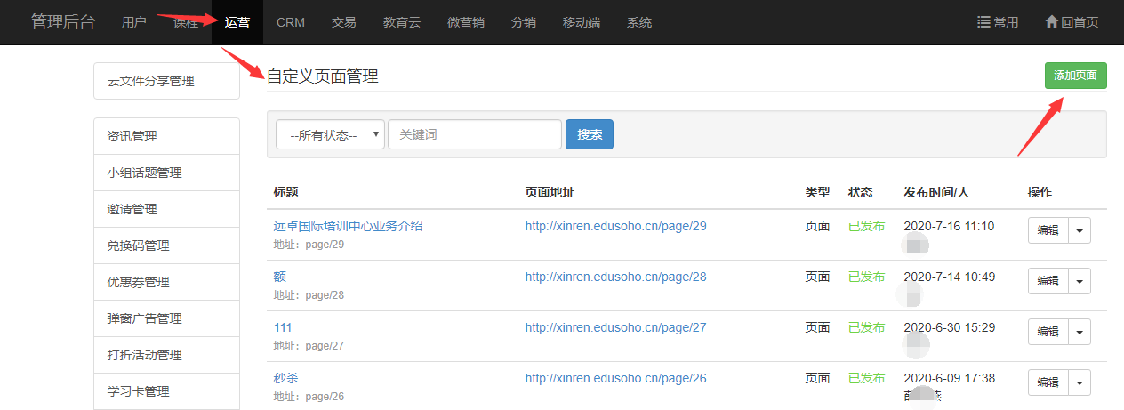 路径:【管理后台】-【运营】-【自定义页面管理】。