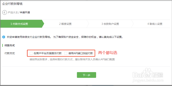 在付款方式设置中,需同时勾选“在商户平台页面提交付款”和“使用API接口发起付款”。