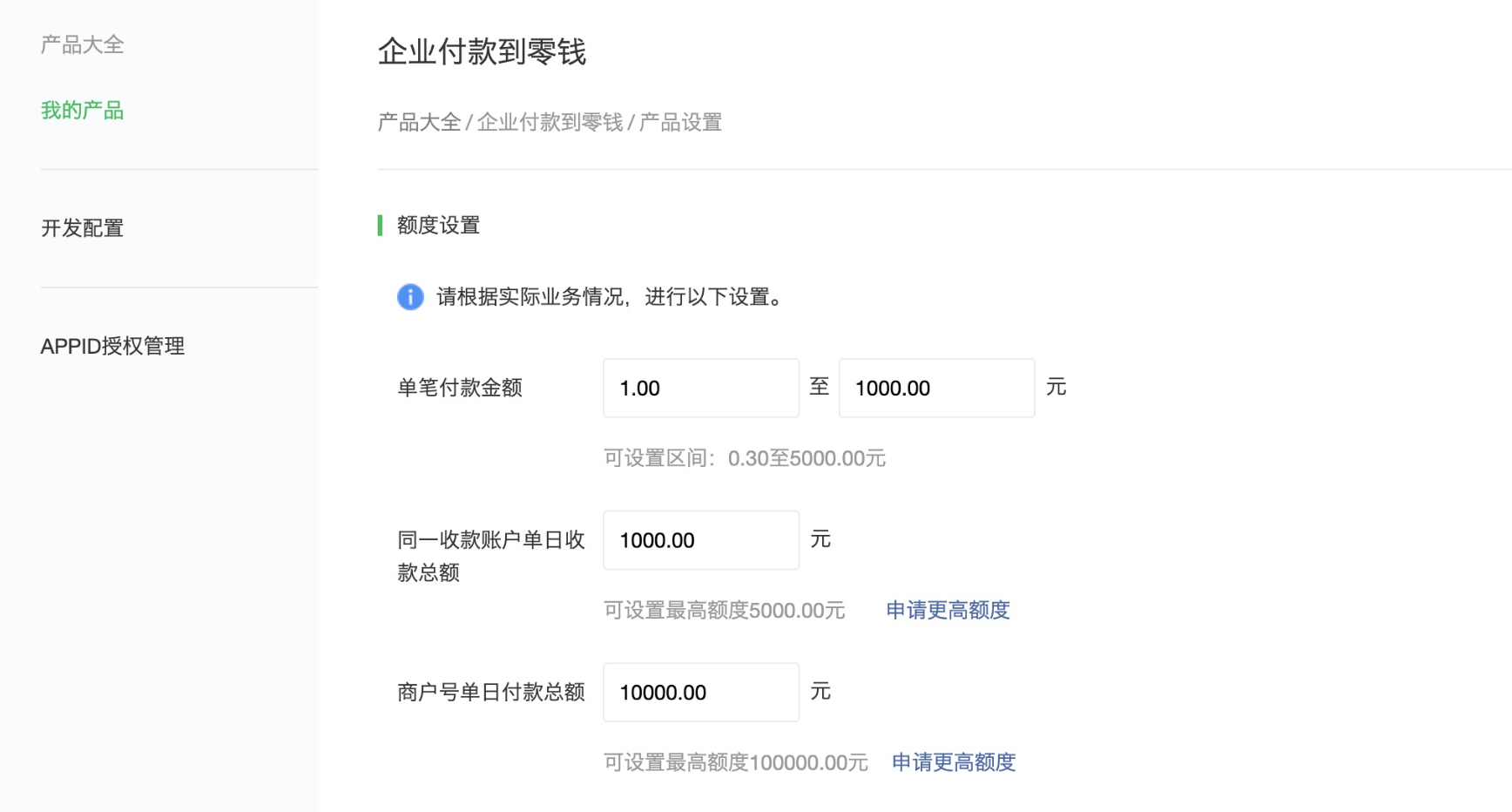 若在微信商户中心对自动提现金额做了限制,请在“我的产品”中找到“企业付款到零钱”产品,设置对应的自动提现额度。
