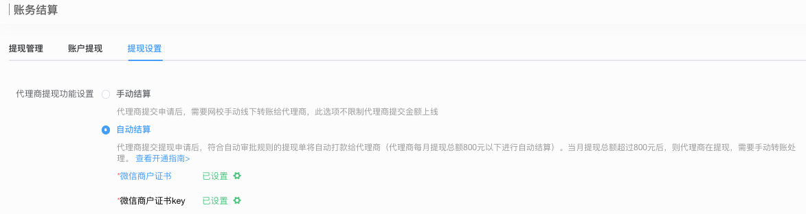 由于本期未提供超过800元部分的个税计算功能,故自动提现超过800后,需要手动结算处理。网校通过网校侧分销后台—财务结算—提现管理—提现设置页面,选择自动结算,可以选择每个代理商每月自动提现金额只能为800元,超过部分当月不支持再提现,需要下个月再申请提现。或者选择超过800后,设置一个手动提现的门槛,由手动结算处理。