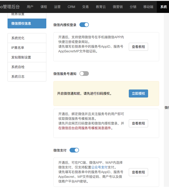 分销提现设置功能完成后,请进入网校后台—系统—微信授权信息,开通“微信内授权登录”和“微信支付”。