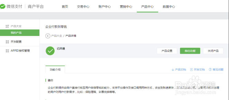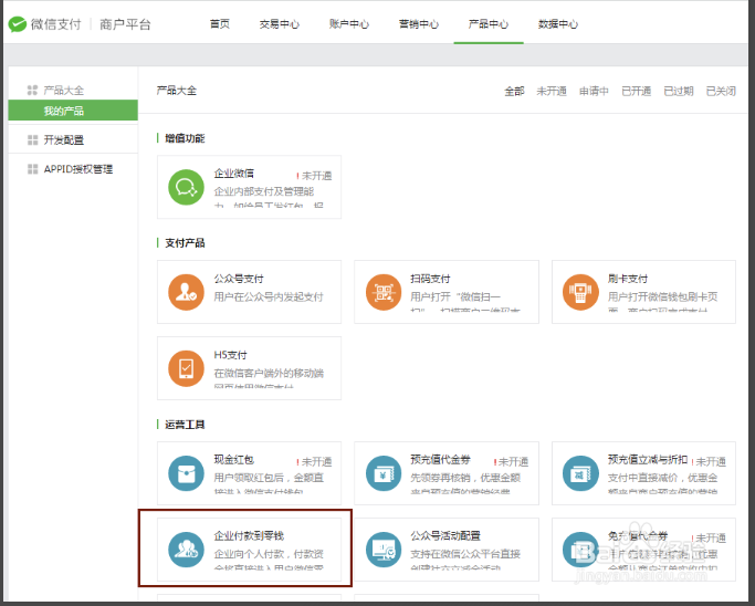 3、登录微信支付商户平台-产品中心,开通企业付款。
