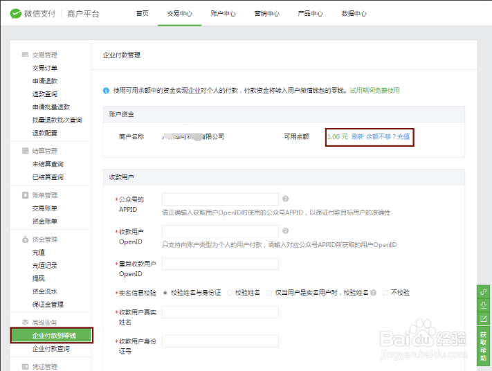 登录微信支付商户平台,点击“产品中心-企业付款到零钱”。