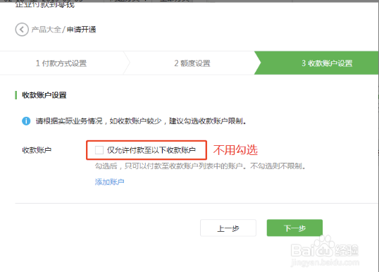 在收款账户设置中,不用勾选“仅允许付款至以下收款账户”。