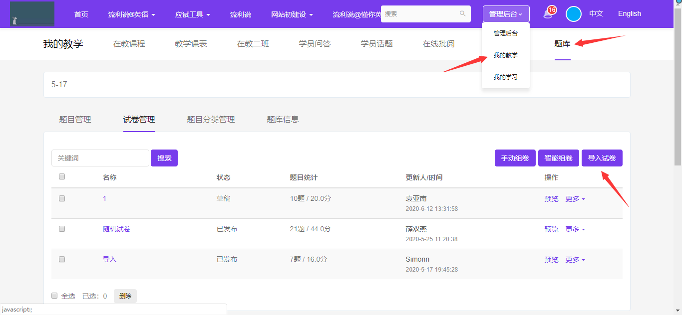 题目导入导出是商业版插件题库增强版的功能,商业版用户可以在【管理后台】-【教育云】-【ES应用】中安装,安装后可以在【我的教学】-【题库】-【试卷管理】,开源版用户需购买后使用,购买地址:http://open.edusoho.com/app/179