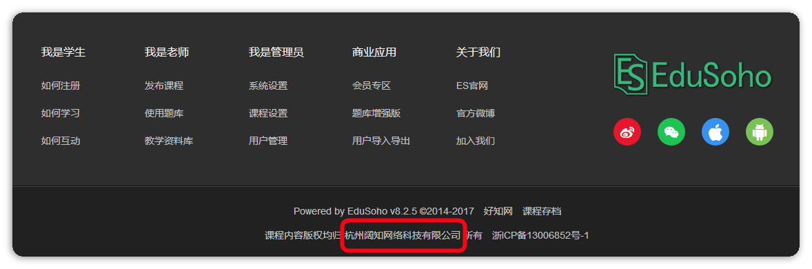 显示在前台页面底部,edusoho版权信息后方,具体显示如图所示: