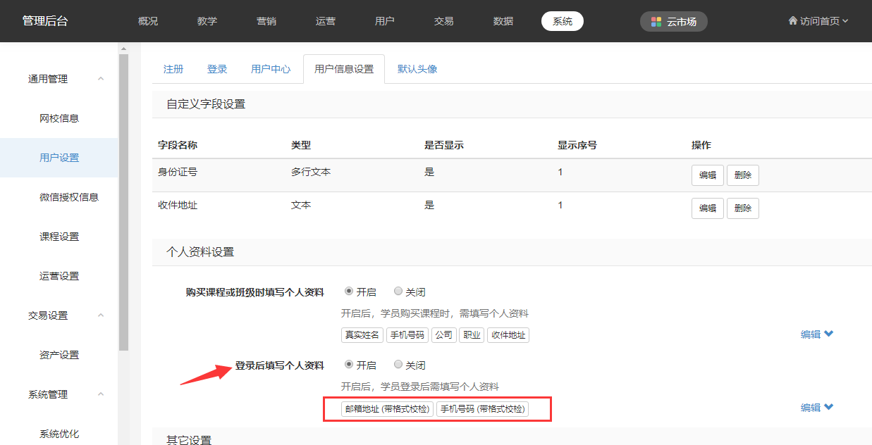 【管理后台】-【系统】-【用户设置】-【用户信息设置】-【登录后填写个人资料】开启并选择“手机号码(带格式和短信校验,需要开启云短信)“,注意:如果选择“手机号码(带格式校验)”,没有短信验证,无法确认手机号码的真实性,用户可以随意填写。