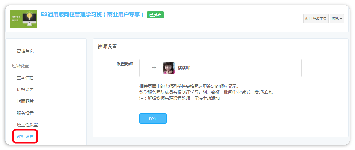 班级教师列表查看路径:【班级管理页】-【教师设置】,仅支持调整教师显示顺序,即用户在班级介绍页看到的班级教师顺序。
