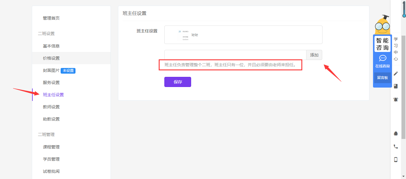 班级管理页的【班主任设置】中,可以添加或修改班级的班主任,同一时间,班主任只能有一名,且必须有教师身份,不一定是班级内的教师。