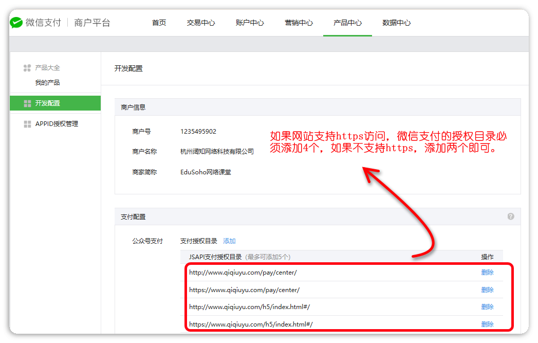 支付授权目录格式:域名/pay/center/和域名/h5/index.html#/;如果使用了https,授权目录必须填写4个。