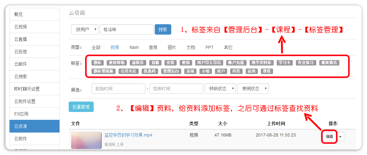 在ES系统中,通过“标签”进行分类管理,“标签”在【管理后台】-【课程】-【标签管理】中添加,在【云资源】或者【教学资料库】中编辑资料时,可以给资料打标签,之后通过标签可查询所有有这个标签的资料。
