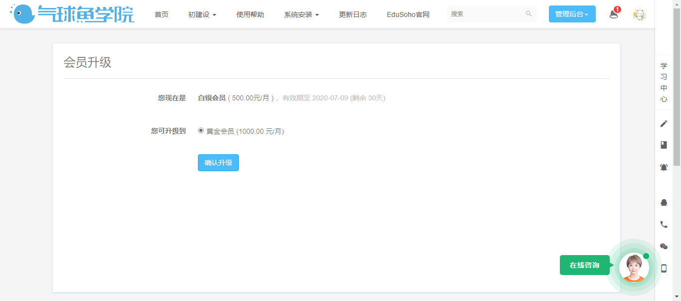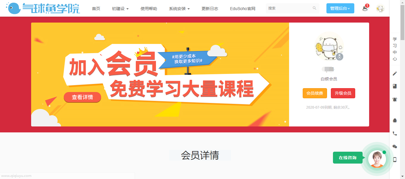 加入了会员后,发现现在的会员等级不满足你的需求,想升级到更高等级会员,你可以进行会员升级操作;会员即将到期,还想享受会员优惠,学习会员课程,你可以续费你的会员。