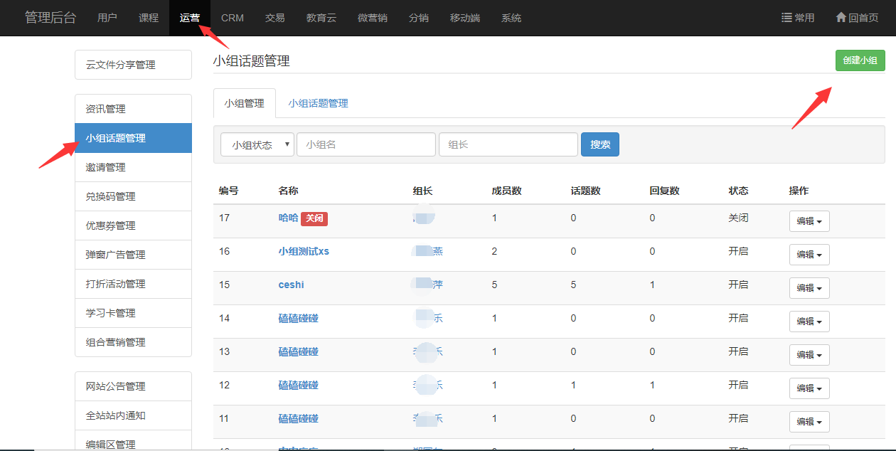 两个位置都可以创建小组: 1、【管理后台】-【运营】-【小组话题管理】创建小组;
