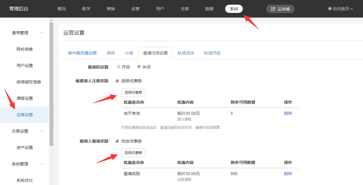操作路径:【管理后台】-【系统】-【运营设置】-【邀请注册设置】;