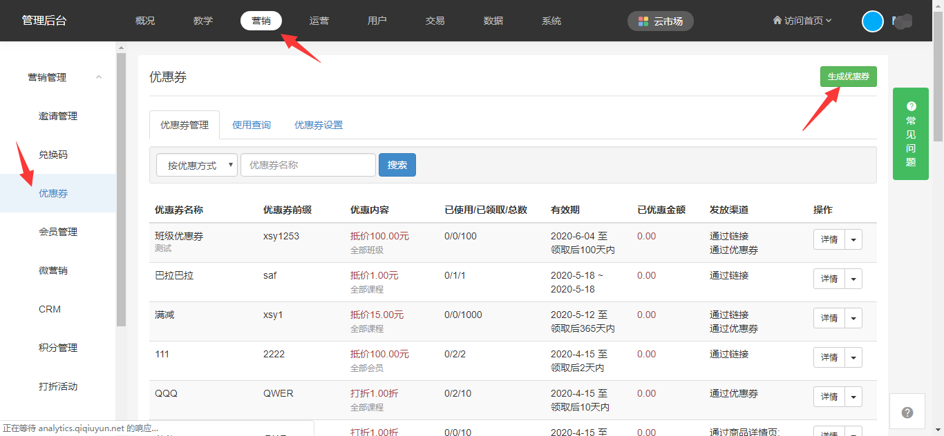 优惠券设置路径:【管理后台】-【营销】-【优惠券】;