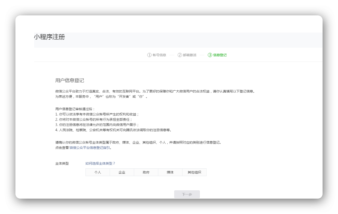 点击激活链接后,继续下一步的注册流程。请选择主体类型选择,完善主体信息和管理员信息。