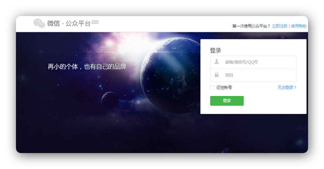 在微信公众平台官网首页(mp.weixin.qq.com)点击右上角的“立即注册”按钮。