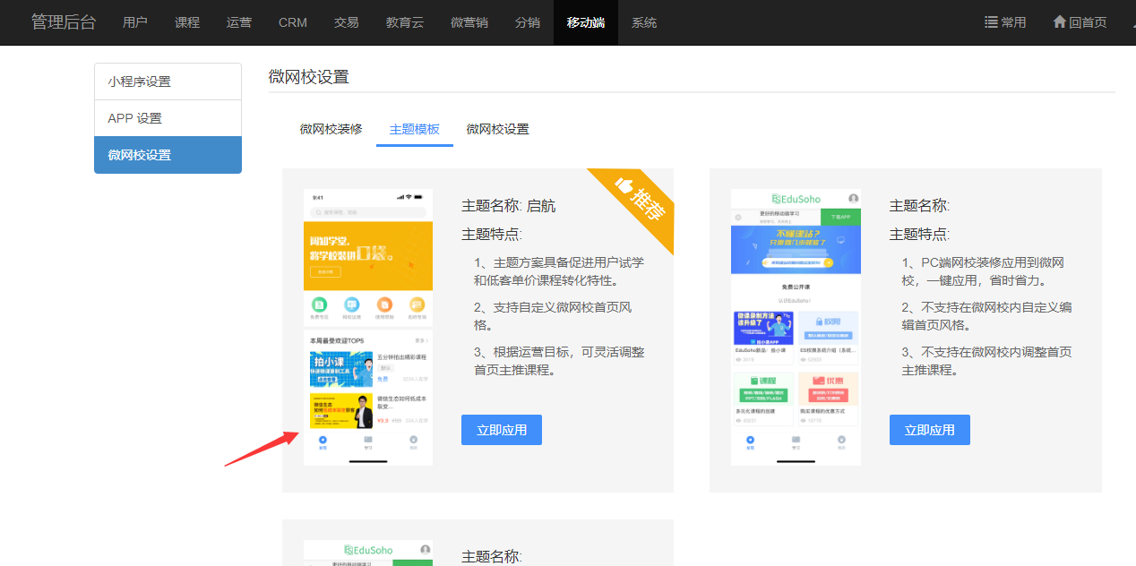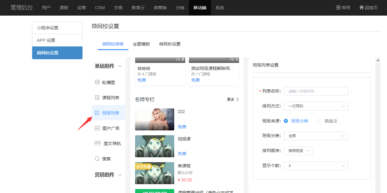 操作路径:【管理后台】-【移动端】-【微网校设置】;