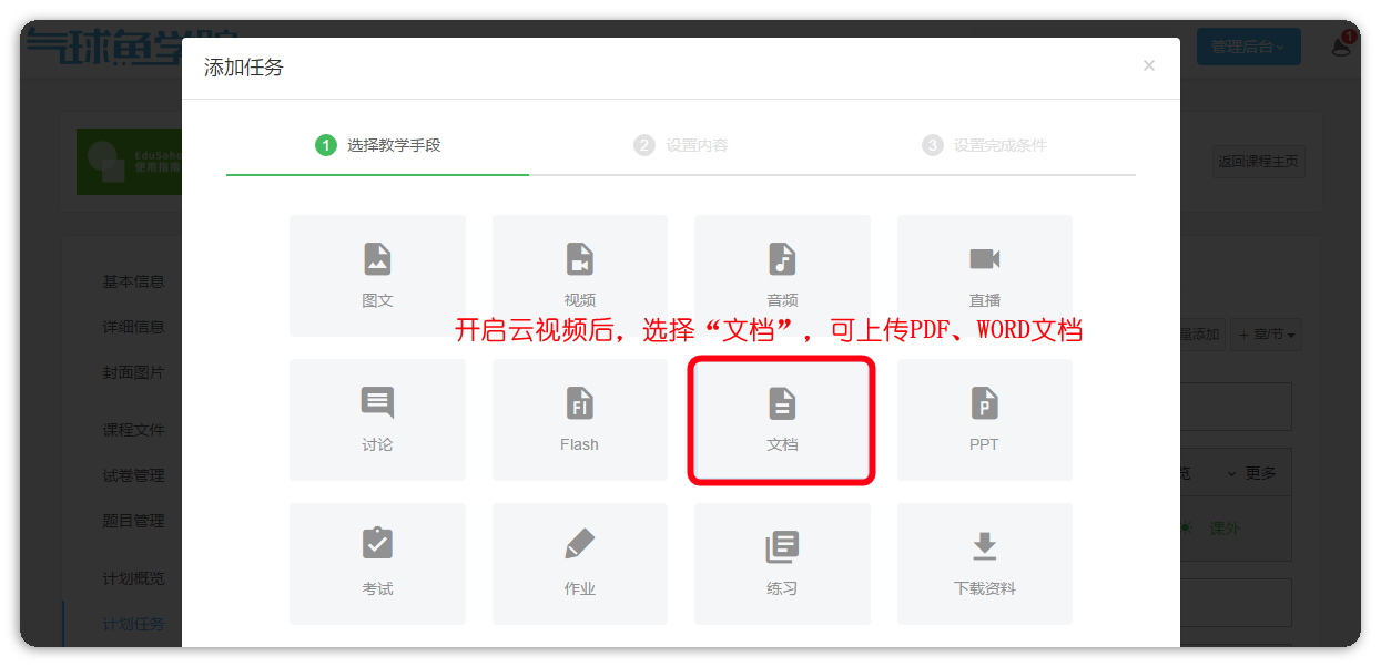 开通ES教育云之后,在【管理后台】-【教育云】-【云视频】中开启云视频,即可到课程内选择文档任务,上传PDF,课程发布后,学员加入课程即可查看此PDF。