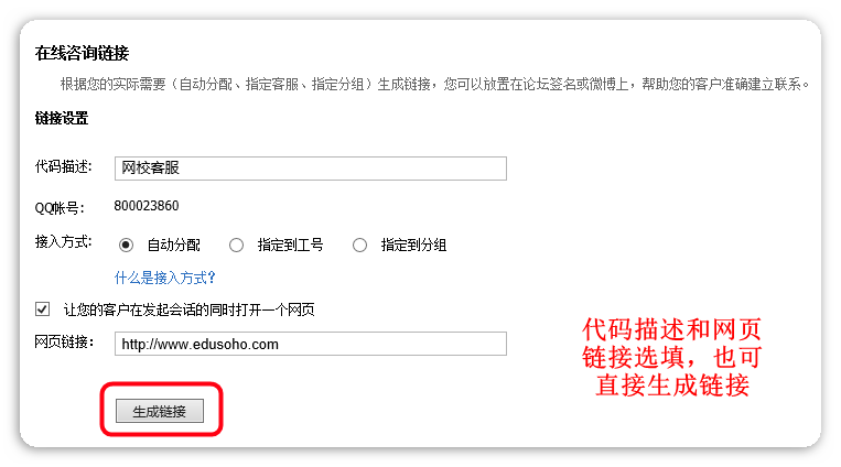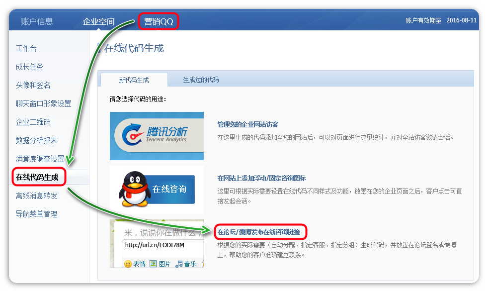 2)登录后,找到【营销QQ】-【在线代码生成】,选择【在论坛/微博发布在线咨询链接】如下操作;