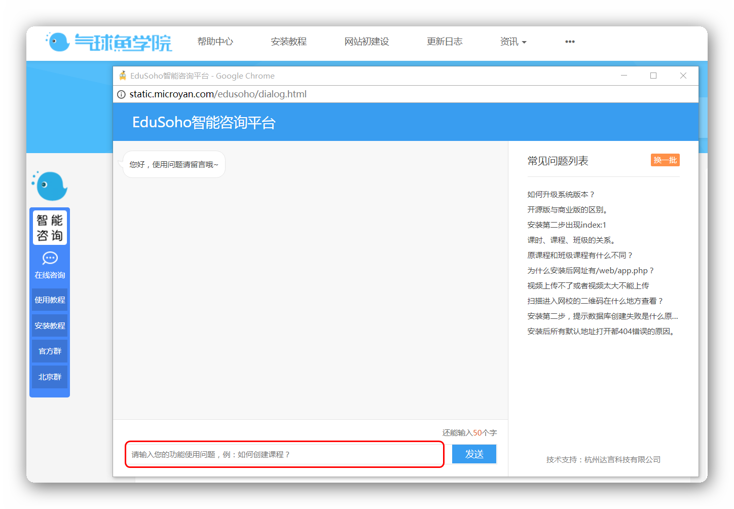 访问网站,在页面中点击云问答浮动框,输入关键字,如果问答库中有相关问题,会自动展示,如果没有,则提醒无答案。