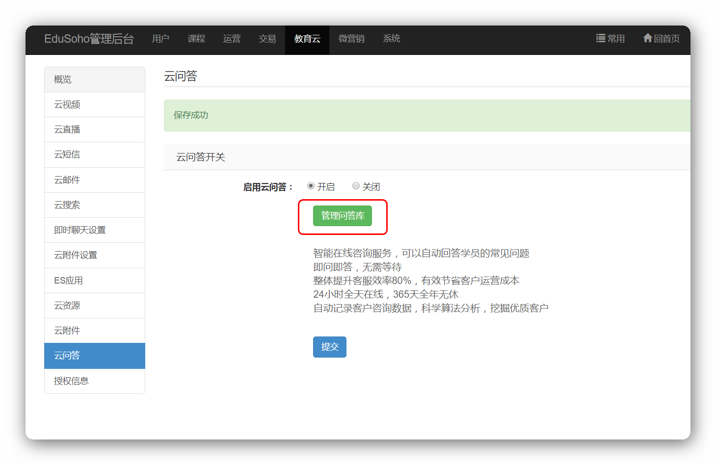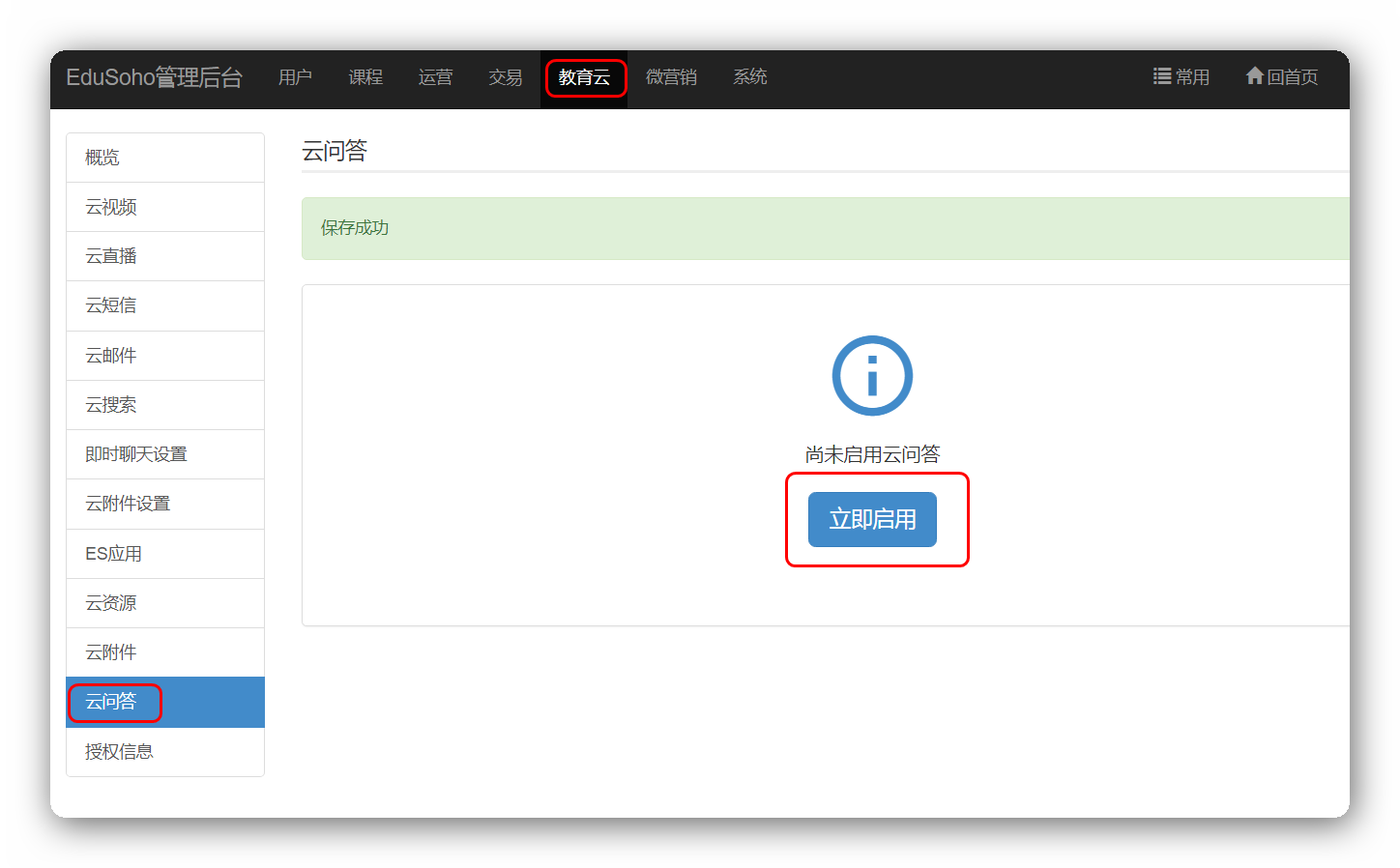 路径:【管理后台】-【教育云】-【云问答设置】中启用云问答。