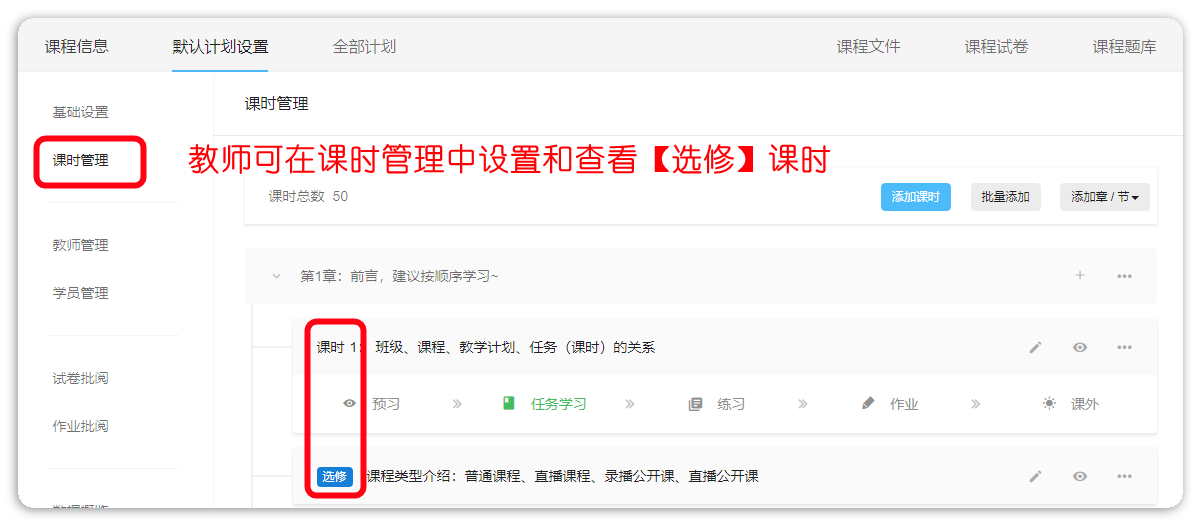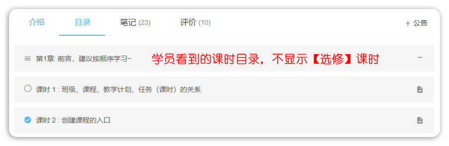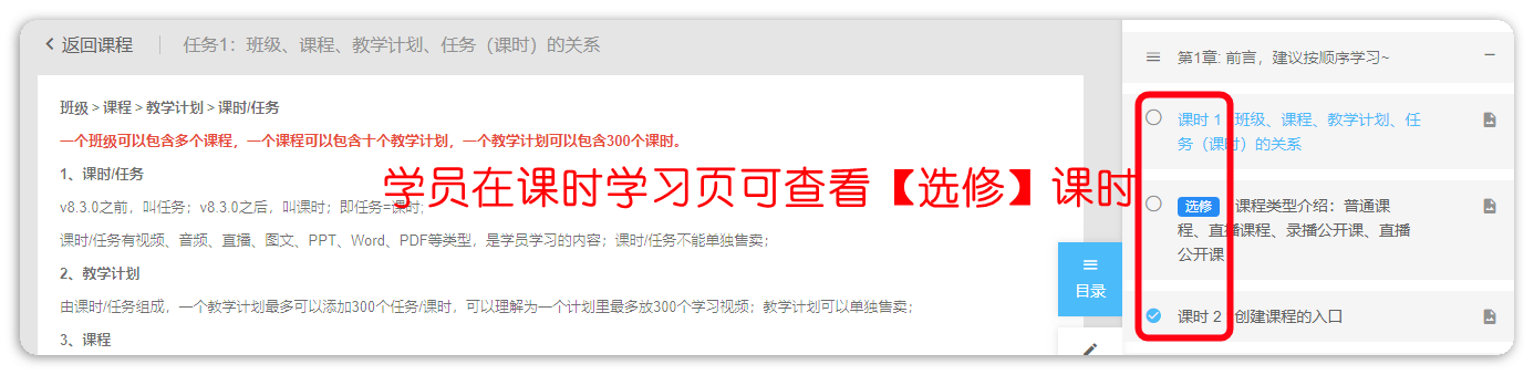 选修课时不显示在课程目录中,需要到课时学习页中查看。