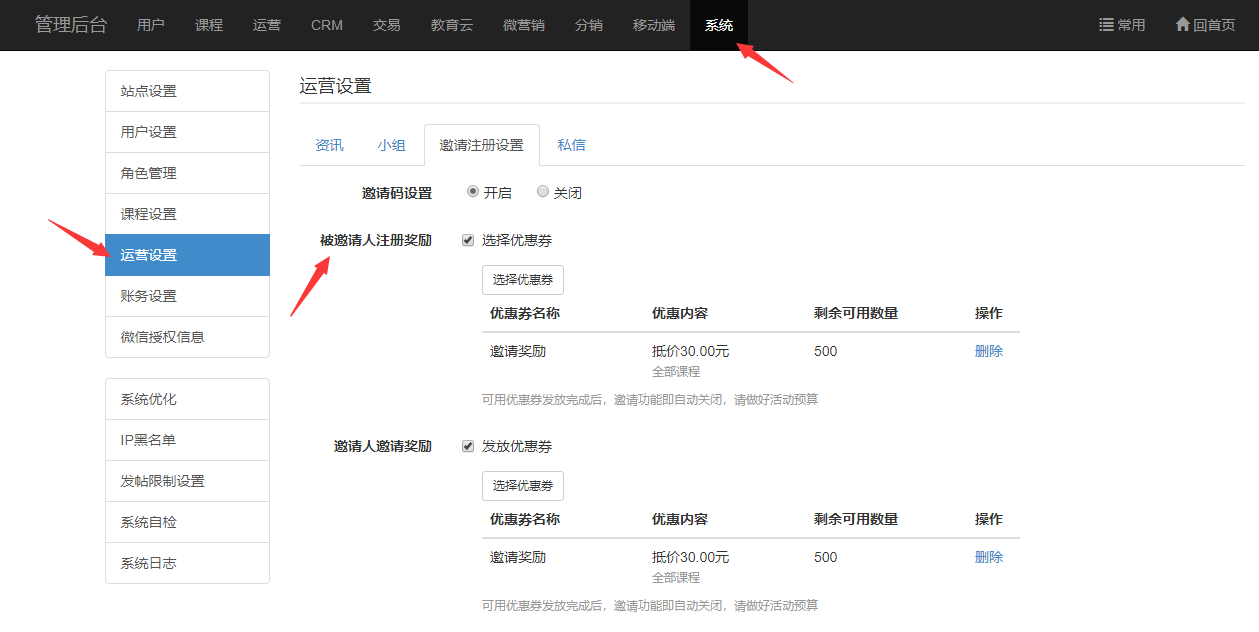 系统的另一个功能--邀请注册,可以设置成功邀请好友注册,好友在网站购买课程后,给邀请人返优惠券。