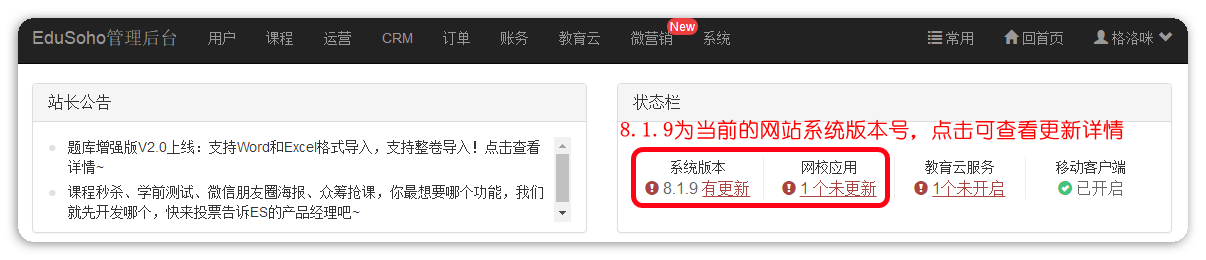 登录超管账号,进入管理后台,管理后台首页有一个【状态栏】,可以看到系统版本号,例如v8.1.9;