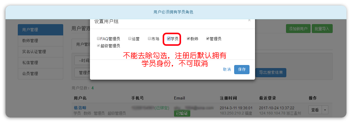 注册用户默认为”学员“身份,任何一个用户在系统里都扮演着一个角色,ES系统将默认的最低角色定义为”学员“,所以不能勾选取消。