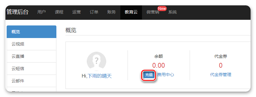 在【网校后台】-【教育云】-【概览】-【充值】点进去输入金额,可以使用支付宝支付 或登录ES教育云充值:open.edusoho.com