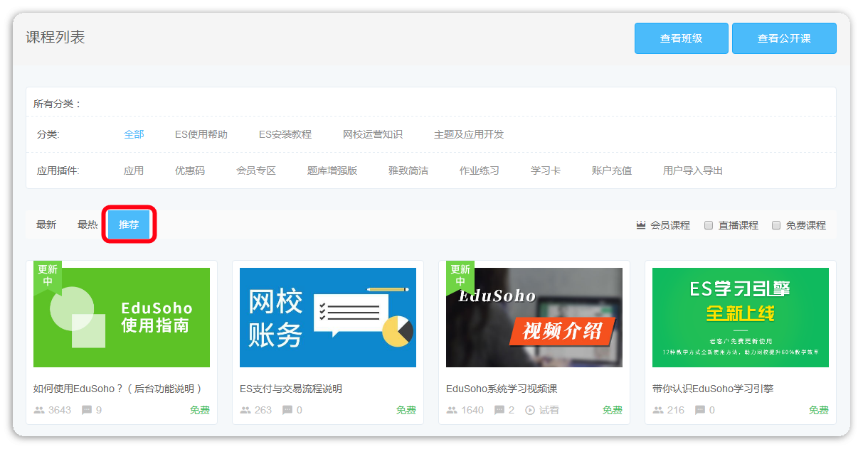 课程推荐后,可以在主题设置里或者系统下的课程设置里,设置默认显示推荐排序,推荐的顺序即【管理后台】-【课程】-【课程管理】-【推荐管理】中的显示顺序。