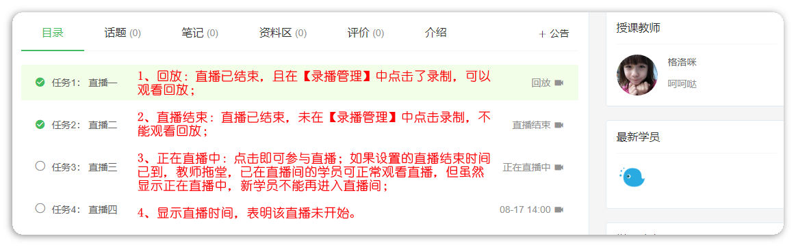 1、回放:直播已结束,且在【录播管理】中点击了录制,可以观看回放;