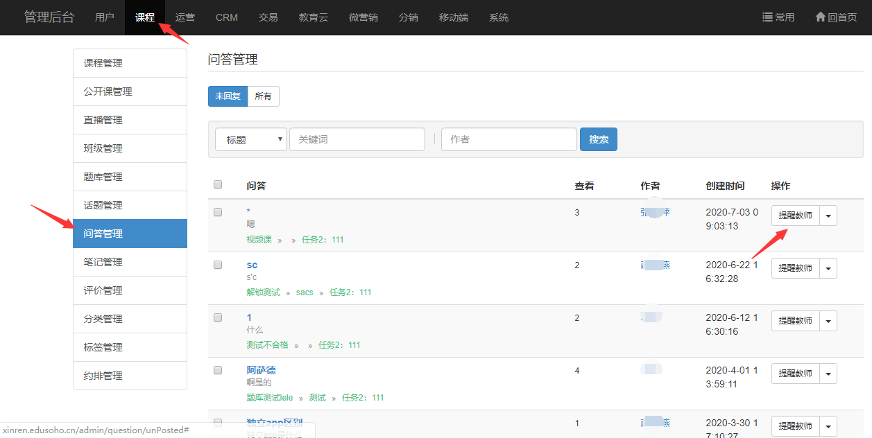 路径:【管理后台】-【班级】-【问答管理】-【提醒教师】,管理员点击“提醒教师”,系统会给教师发送消息,提醒回答问题。