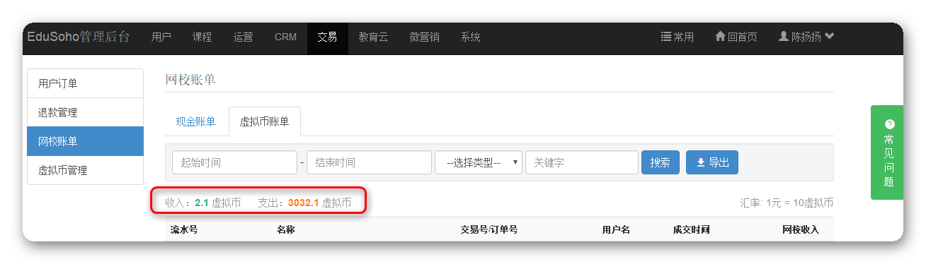 收入是指用户通过虚拟币消费后,网校收入的虚拟币金额;