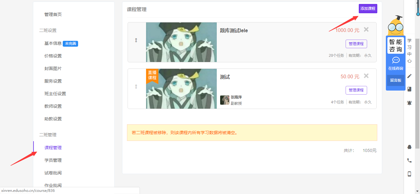 A课程添加到班级,系统自动生成B课程,在未解除同步的情况下,A和B课程除学员数据以外其他都一致,A课程修改课程标题价格课时内容等信息,B课程会同步修改,A课程是原课程,B课程是班级课程。