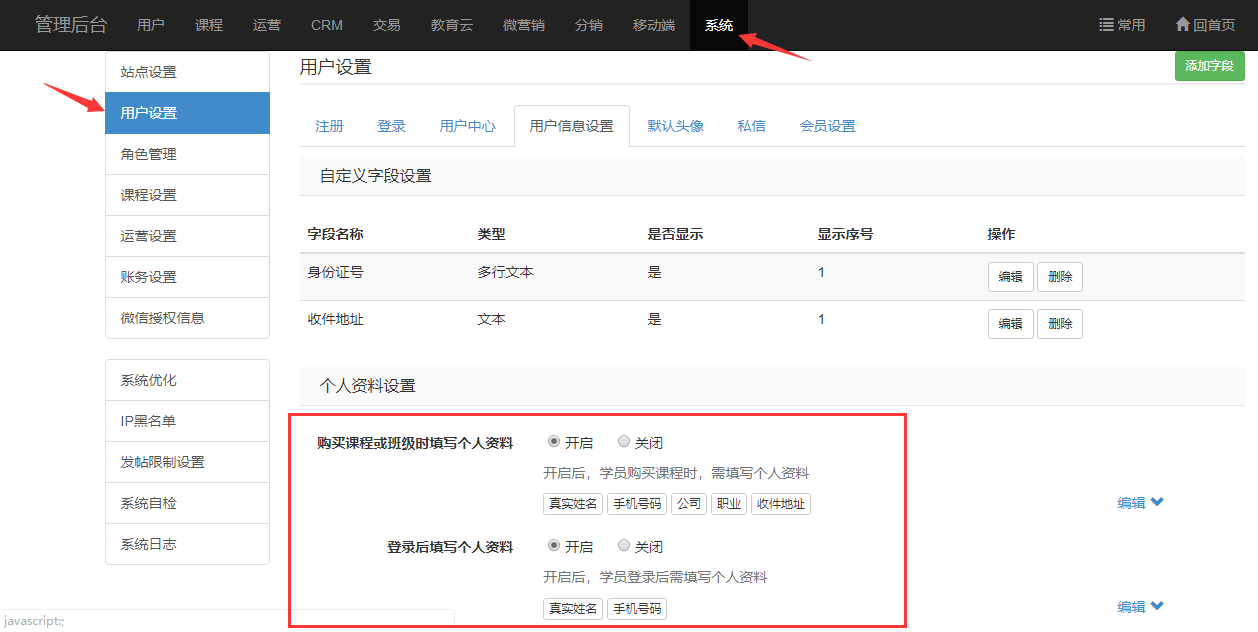 路径:【管理后台】-【系统】-【用户设置】-【用户信息设置】