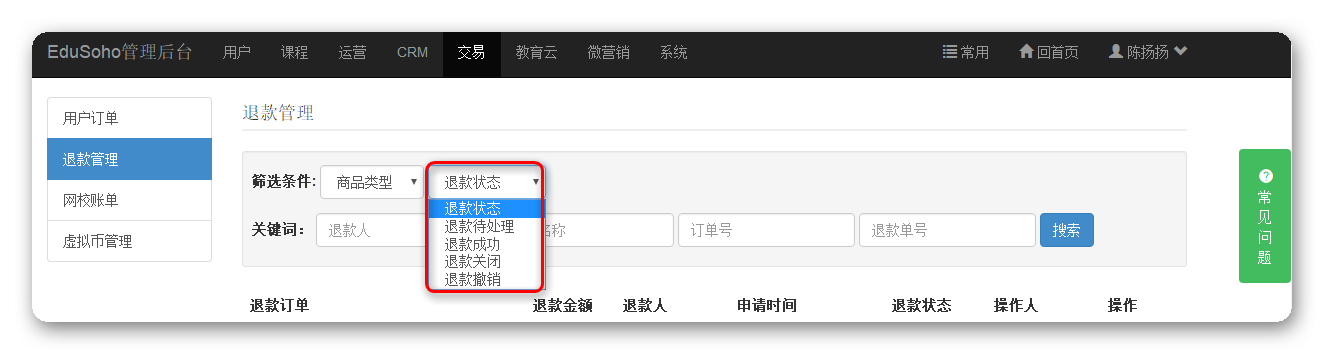 用户已申请:用户申请退款,网校未处理 退款成功:网校已经同意用户退款且退款成功(虚拟币退回虚拟币账户,现金需要网校线下退款,系统无自动退款功能) 退款拒绝:网校拒绝用户退款 退款撤销:用户自己撤销退款申请