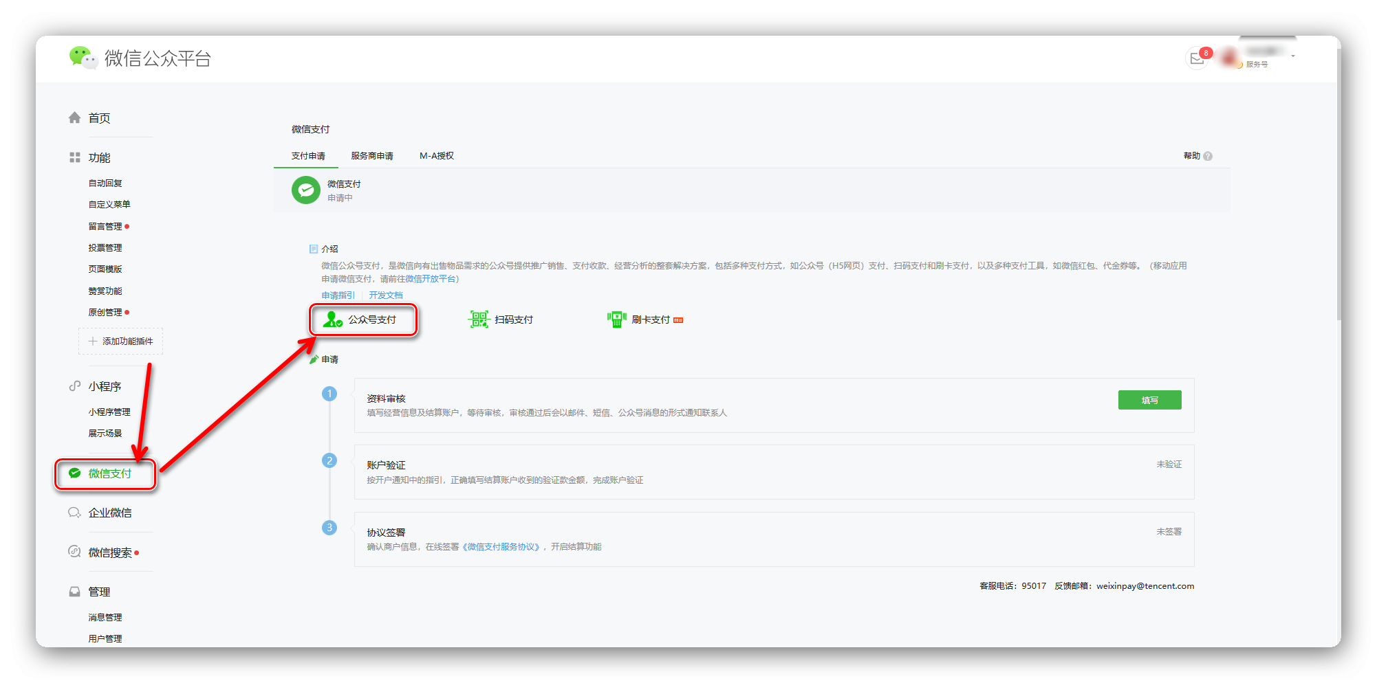 登录公众平台,点击左侧菜单【微信支付】,开始填写资料等待审核,审核时间为48小时内。