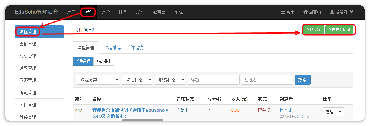 EduSoho系统中有两个创建课程(普通课程、直播课程)入口。