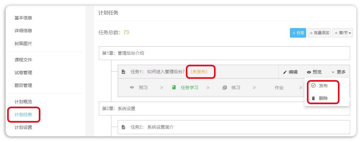 2、删除课时/任务,删除之后该任务就没有了,不会再展示。