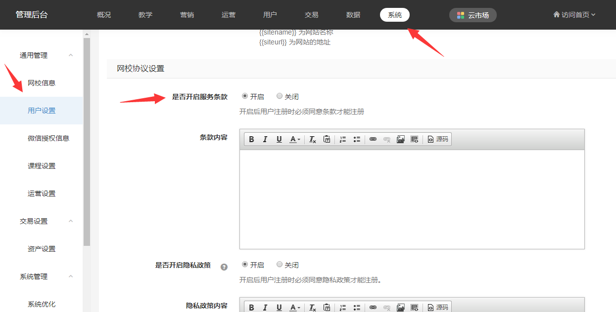 可以,【管理后台】-【系统】-【用户设置】-【注册】开启服务条款,开启后,用户注册时必须勾选“我同意”才能完成注册。