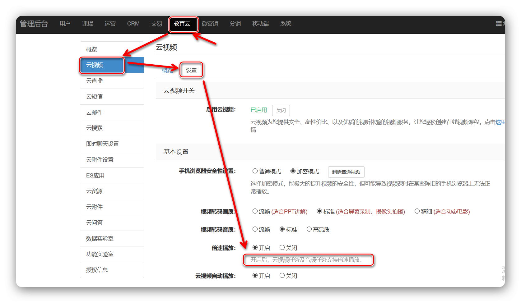 开启倍速播放:【管理后台】-【教育云】-【云视频】-【云视频设置】;