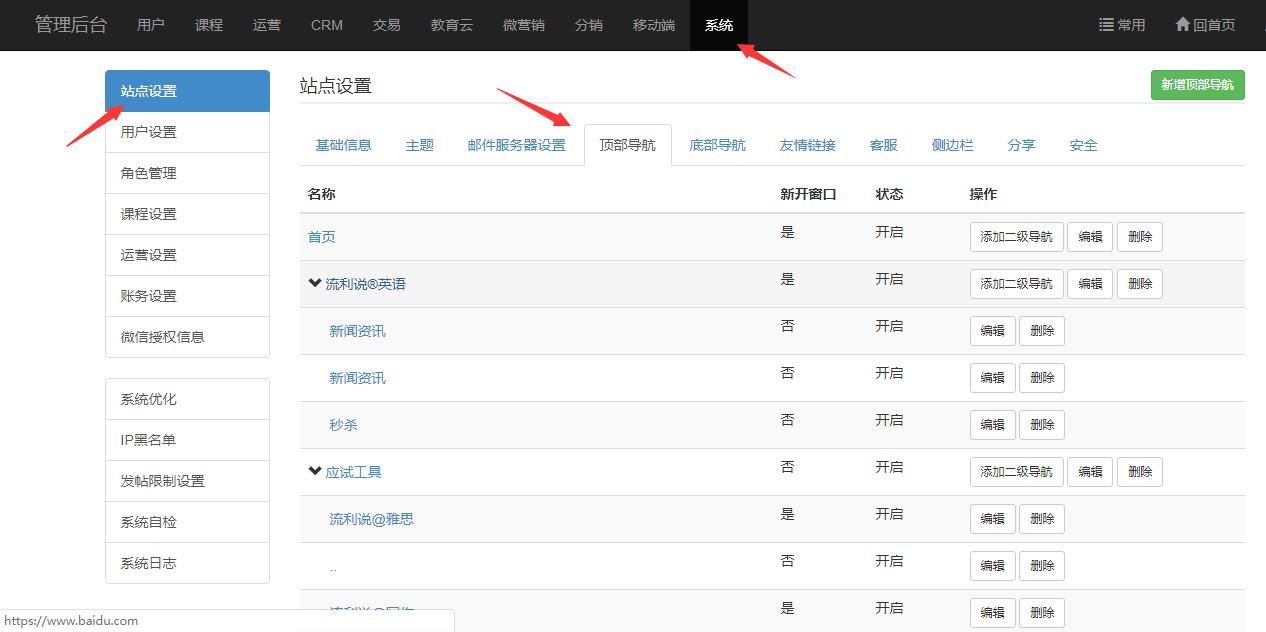 顶部导航只能设置两级,可以在【管理后台】-【系统】-【站点配置】-【顶部导航】中设置。