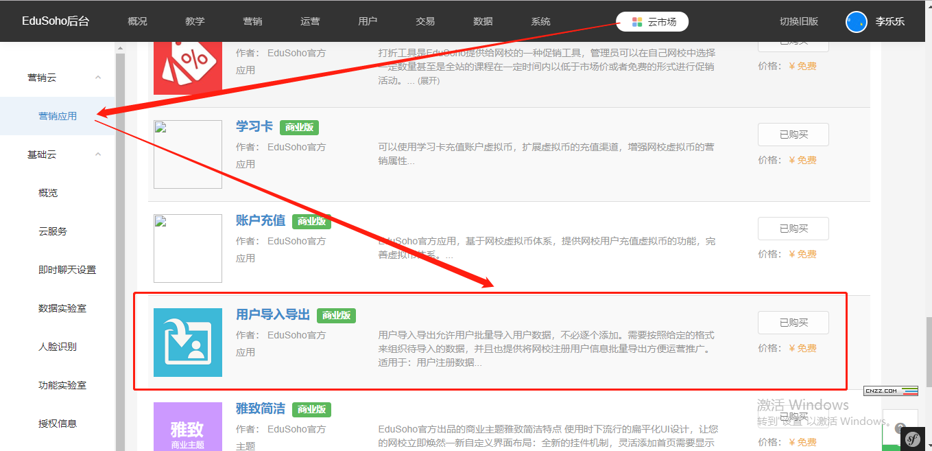 首先需要去【管理后台】-【云市场】-【营销应用】安装好用户导入导出插件