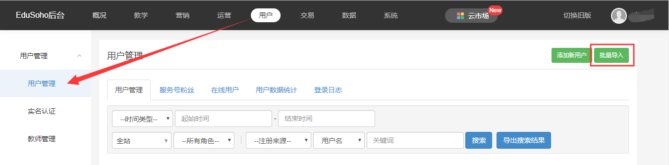 注意:用户导入导出是商业插件,开源版需购买后安装,购买链接:http://open.edusoho.com/app/180