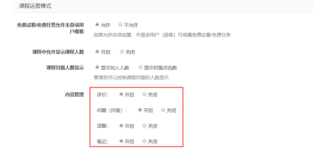 路径:【管理后台】-【系统】-【课程设置】-【课程】-【课程运营模式】,可对课程中的问题,话题,笔记进行管理。